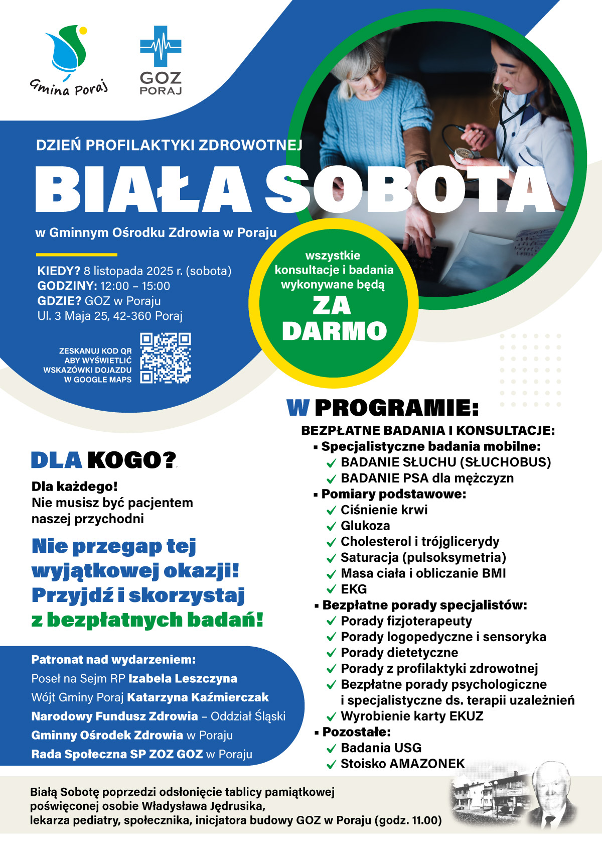 Zanim rozpoczną się badania i konsultacje, uczestnicy wydarzenia wezmą udział w uroczystym odsłonięciu tablicy pamiątkowej poświęconej Władysławowi Jędrusikowi – lekarzowi pediatrze, społecznemu działaczowi i inicjatorowi budowy Gminnego Ośrodka Zdrowia w Poraju.